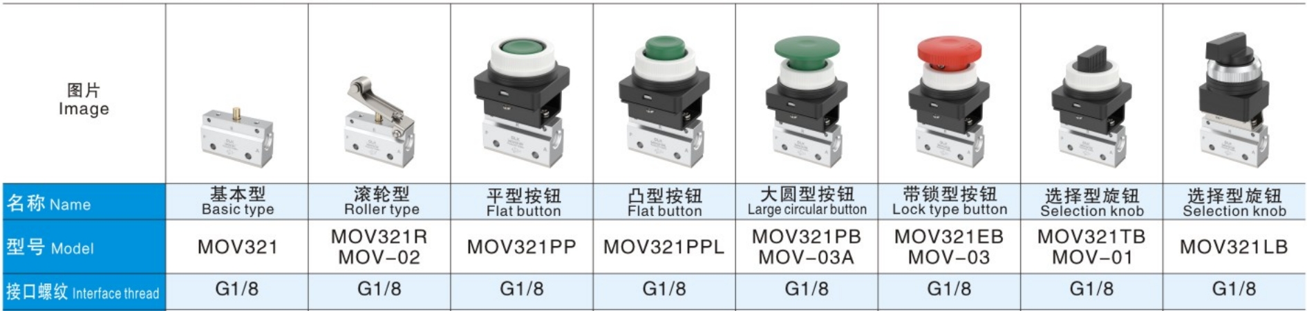 Utmärkt korrosion och slitstyrka MOV 321 3/2way MechanicalValve tillverkas av högkvalitativt allumunim legeringsmaterial.olk Företagets mekaniska knappventiltrådar klara med bra tätning som minimerar luftläckage. Knapparna erbjuder en bra taktil känsla och snabb rebound.
