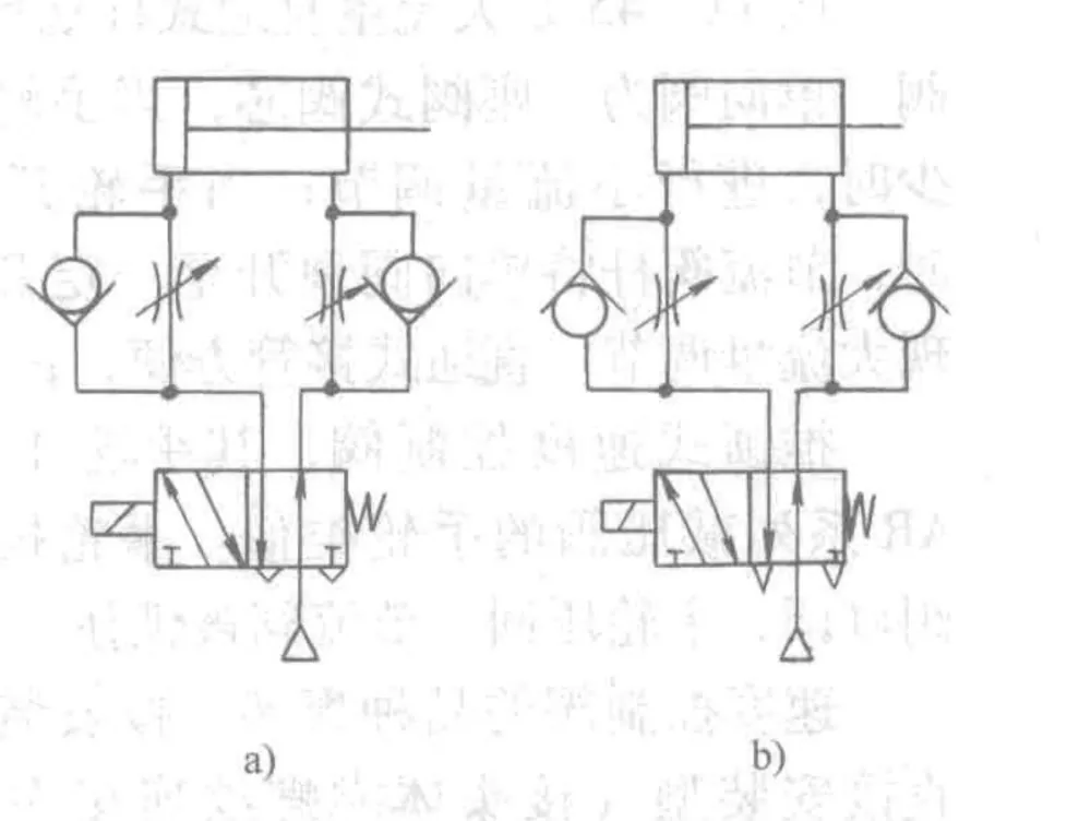 · I (a) (avgasstrypning), när riktningsventilen är aktiverad, öppnas backventilen på cylinderns inloppssida, vilket gör att den stavlösa sidan kan fyllas snabbt. Luften på stavsidan kan bara släppas ut genom gasspjällsventilen. Genom att justera gasspjällsöppningen kan cylinderhastigheten styras. Denna metod ger stabil kolvrörelse och är den mest använda kretsen.