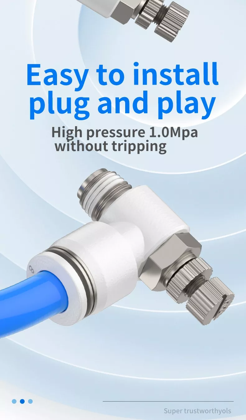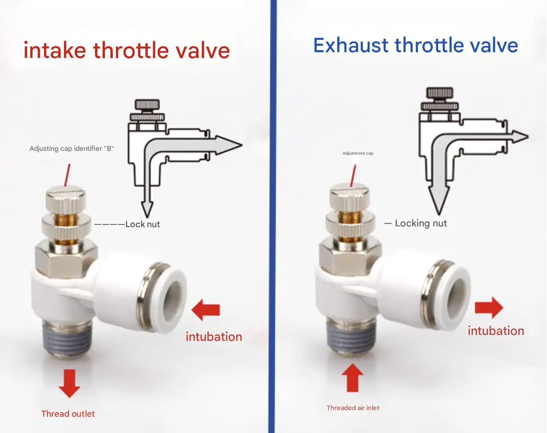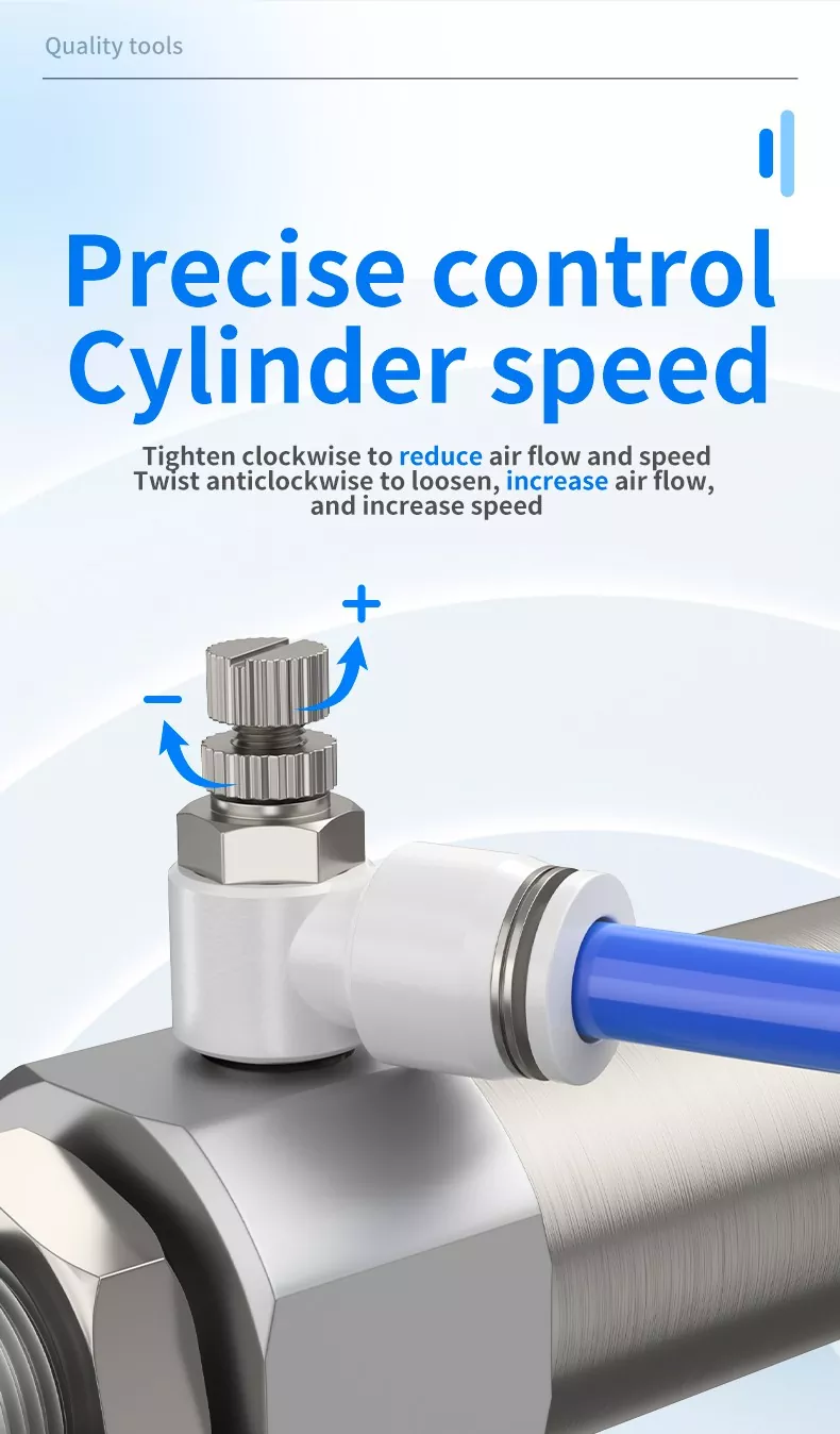 Hastighetsregulatorer är vanliga pneumatiska komponenter som används för att justera förlängnings- och indragningshastigheten för ställdon. Strypventiler är i huvudsak flödesjusterande komponenter som styr cylinderhastigheten, men deras installationspositioner, strypriktningar och karosskonstruktioner skiljer sig åt. Enligt styrmetoden kan de delas in i avgasstrypningstyp och inloppsstrypningstyp.