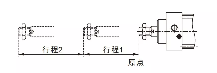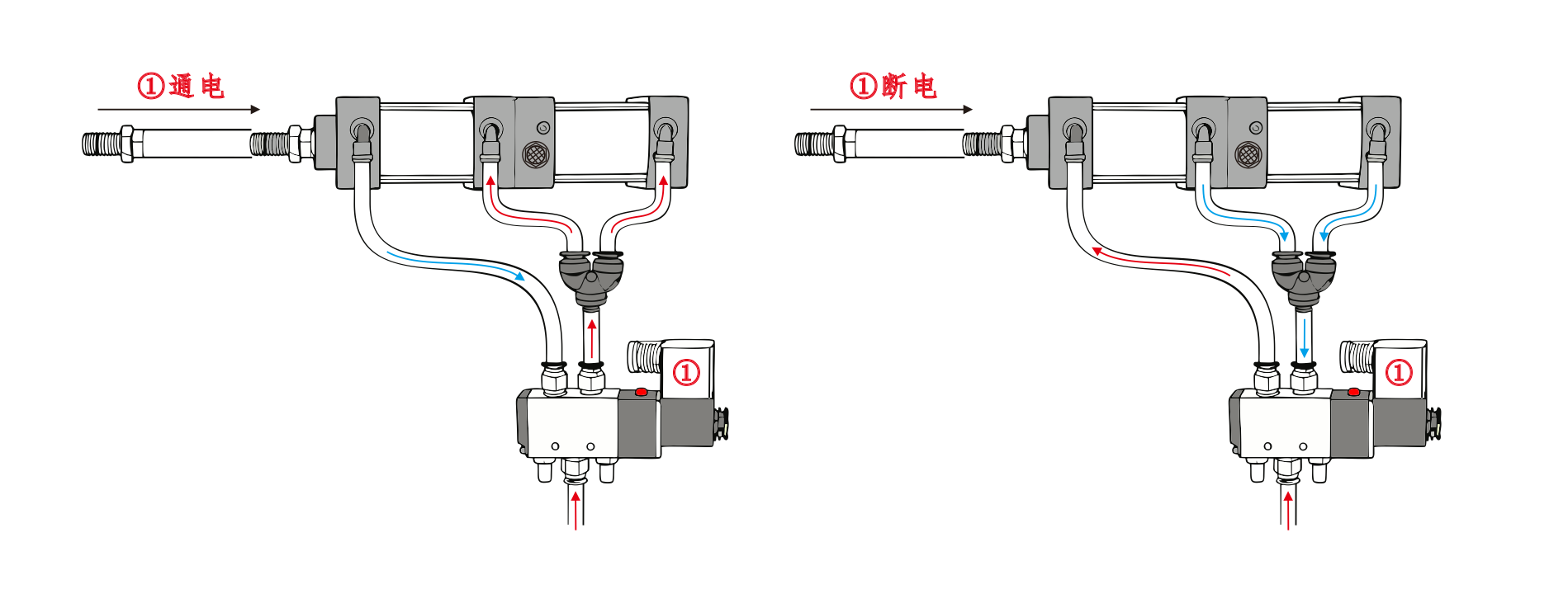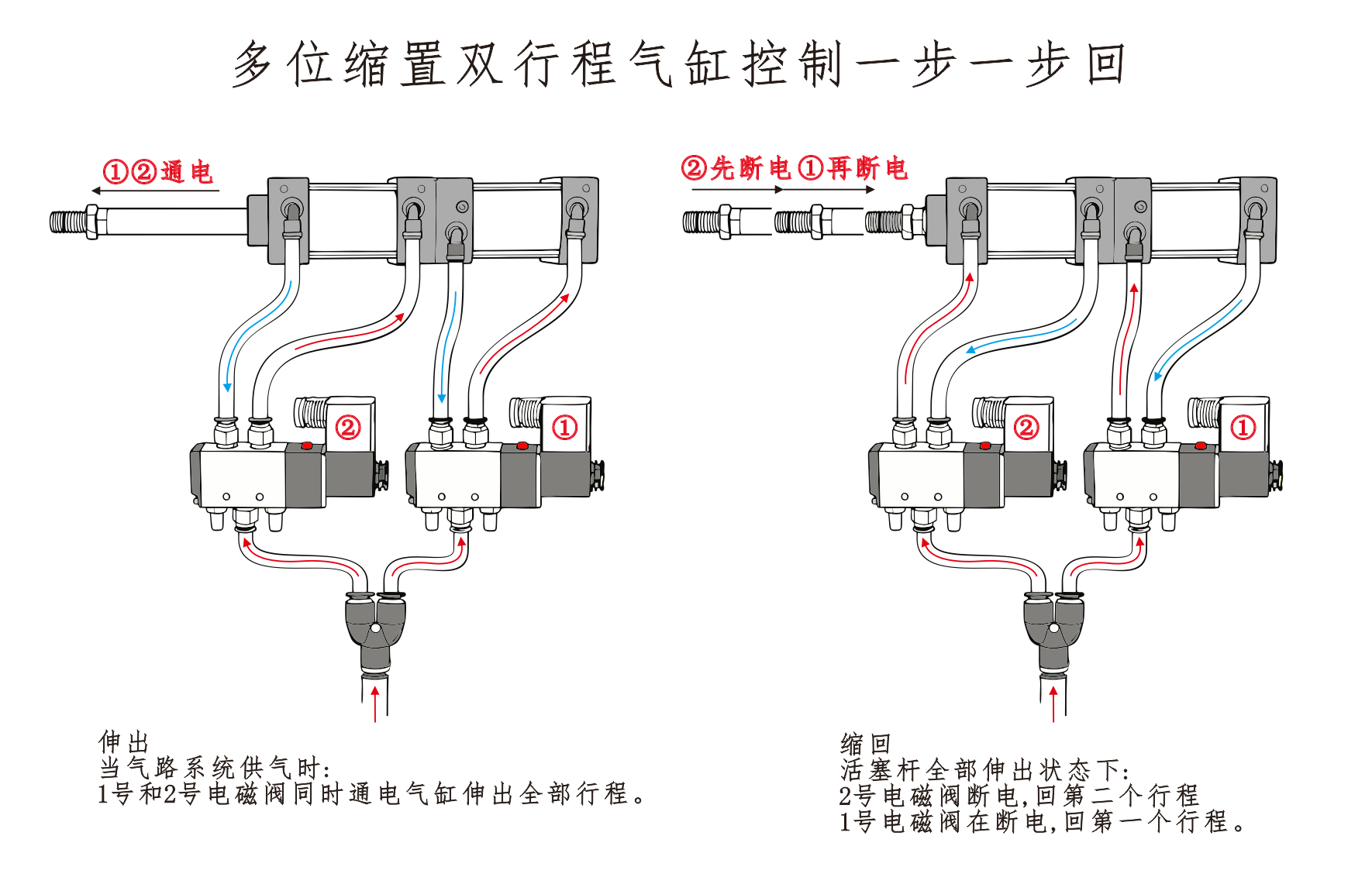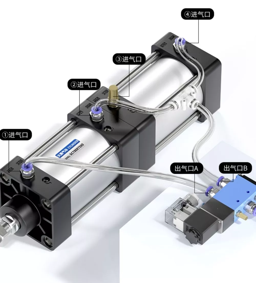 Cylinder①s luftintag är anslutet till port A på magnetventilen, och luftinloppet på cylinder④är anslutet i serie till port B på magnetventilen. Cylinder③s luftintag är anslutet till en ljuddämpare. När port A på magnetventilen aktiveras förblir cylindrarna i det indragna läget. När port B är strömsatt börjar cylindrarna att fungera.
